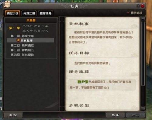 上图主线小绾儿的主线苦寻身世没做,点击后即可打开如下图显示的任务界面,点击任务NPC即可自动引导到该NPC处,是不是很方便呢?