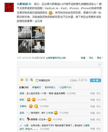 2012年6月6日,备受瞩目的《九阴真经》内测开启,此次免激活,不删档测试激起了无数玩家的武侠热情,而于同期开启的“八大活动迎内测,千万豪礼送不停”活动,更是吸引了无数玩家的热情参与,火爆程度可见一斑。现在,20天过去了,活动也已接近尾声,蜗牛兑现承诺的时刻已然到来,让玩家垂涎三尺的MacBook Air、iPad2、iPhone4、iPhone4S和游戏周边等实物奖励也已陆续到位,等待回馈玩家的支持。