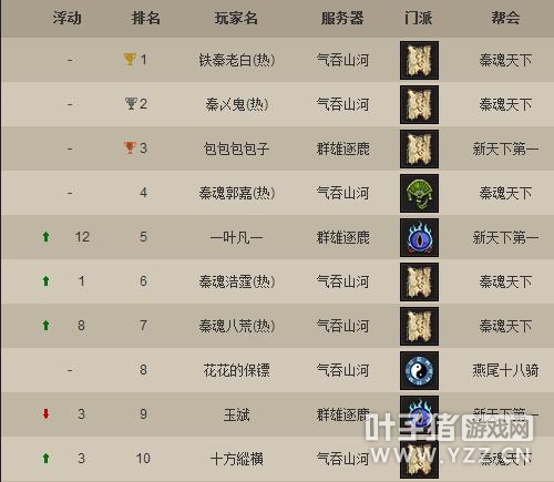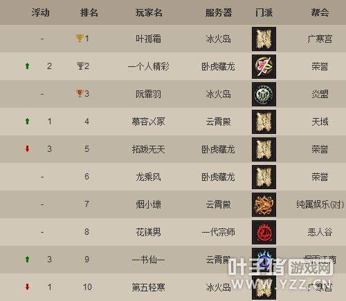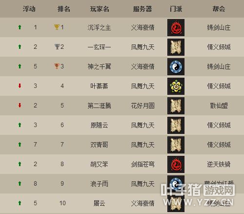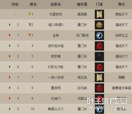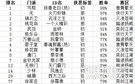 基于目前四内阶段丐帮与锦衣卫较为强势的原因,截止上周末,五大赛区前十名中,来自这两个门派的弟子可谓占据了前十中的半壁江山,十分强势。其他门派方面,武当、桃花岛、移花宫、君子堂、极乐谷、万兽山庄、金针沈家以及无门派人士均有上榜。恭喜他们!