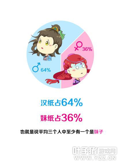 男:64%,女:36%, 也就是说平均三个人中至少有一个是妹子,虽然会有“大叔”因为喜欢峨眉而选择女性角色,但是峨眉本身基数不高,对于最终数据不会有太大影响,看来唯美写实的画风的确是吸引了不少的女玩家。