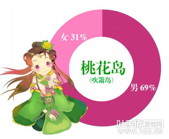 桃花岛 男69% 女31%,很多女侠都想练习,并且比较擅长吹箫,所以你懂得……