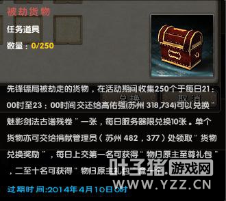 活动期间,每天12:00-21:00所有实力达到“出神入化”(内功点数≥46点)的名俊玩家可至苏州找npc:高佑强(镖师)打探黑衣人去向,根据镖师的指示寻找到黑衣人并击杀后有机会获得“被劫货物”,如果有哪位侠士能帮镖局找回被劫货物,镖局必将重重有赏!