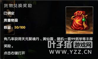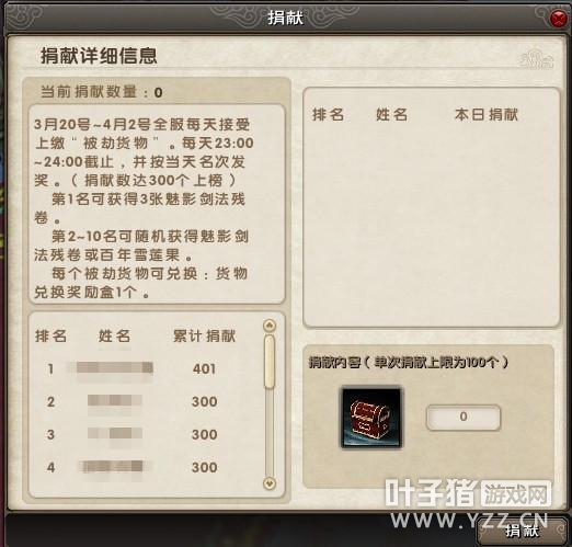 1、在活动期间内,使用单个“被劫货物”可交给捐献管理员(苏州482,377)处领取“货物兑换奖励”,有机会获得99武学等奖励;另外,收集250个“被劫货物”于每日21:00-23:00时间交还给高佑强(苏州393,741)可兑换“魅影宝鉴”一份(内含“魅影剑法古谱残卷”一张),每日服务器限兑换10张。(注:“被劫货物”单个兑换及250个兑换均不计入捐献成绩)