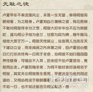而甘愿做婢女。柯俊长期在外打杀,让卢夏有所担忧,卢夏苦心的劝谏却让两人存在了隔阂,后来吵架了、分开了。事后卢夏因思成疾,身体每况愈下,百般后悔她没有与他共生死。希望能见他最后一面。